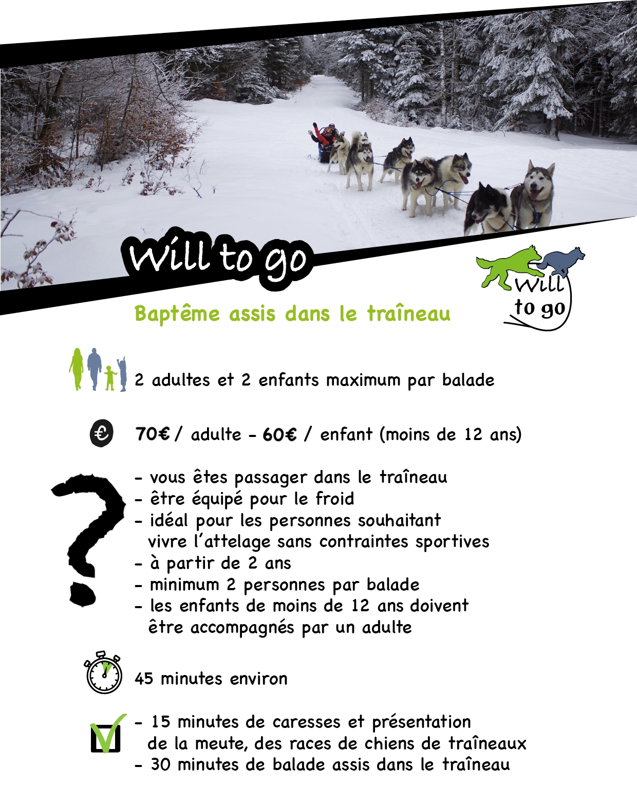 de nos stations en traîneau à chien uniquement sur neige, il faut l’acheter la veille de l’activité uniquement !